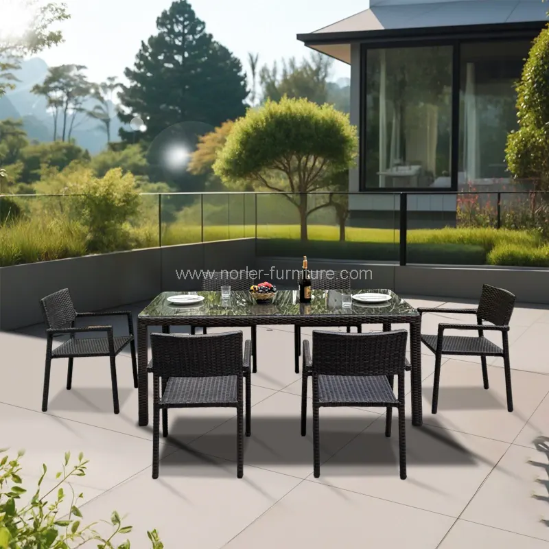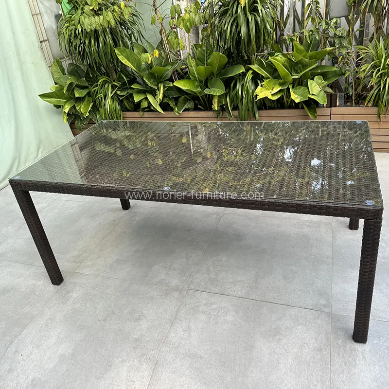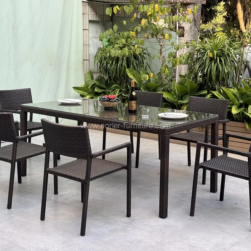 3.Materiaali: Alumiinirunko ulkona käyttämällä jauhemaalaa, säänkestävää PE -rottinki kudonta, ruokailupöytä on karkaistu läpinäkyvä lasi