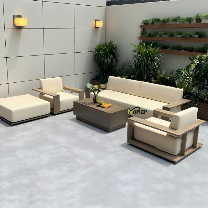 5. Teak Outdoor Sohva: Valmistettu erittäin säänkestävästä luonnontiikistä, tämä sohva on hienojakoinen, erittäin vakaa ja kehittää ylellisemmän tunteen käytössä, joten se on klassinen valinta korkealuokkaisen lomakeskuksen parvekkeen luomiseen.