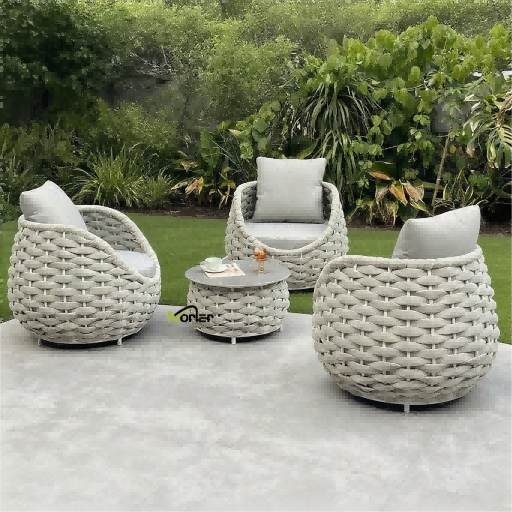 4. Rope Outdoor Sohva: Käsin punottu köysirakenne on visuaalisesti kevyt ja hengittävä, ja alumiinirunko lisää modernia tunnelmaa. Mukavuutta ja taiteellisuutta yhdistävä se on suosittu valinta hienostuneen parvekkeen luomiseen.